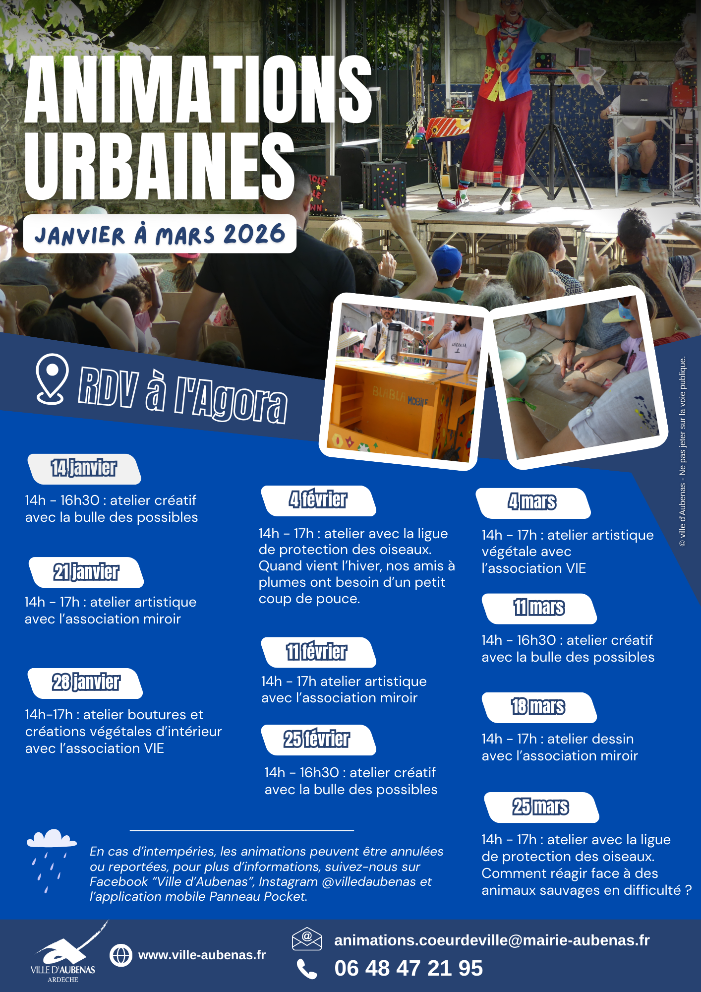 Dans cet espace chaleureux qu'est l'Agora du Champ de Mars, chacun peut se détendre devant un spectacle, participer à une animation créative, ou tout simplement tisser des liens grâce à une activité commune. Artistes, créateurs, intervenants, chargé de mission d'animation de la ville d'Aubenas, tous ont à cœur de faire de chaque mercredi après-midi un moment privilégié de convivialité et de partage.