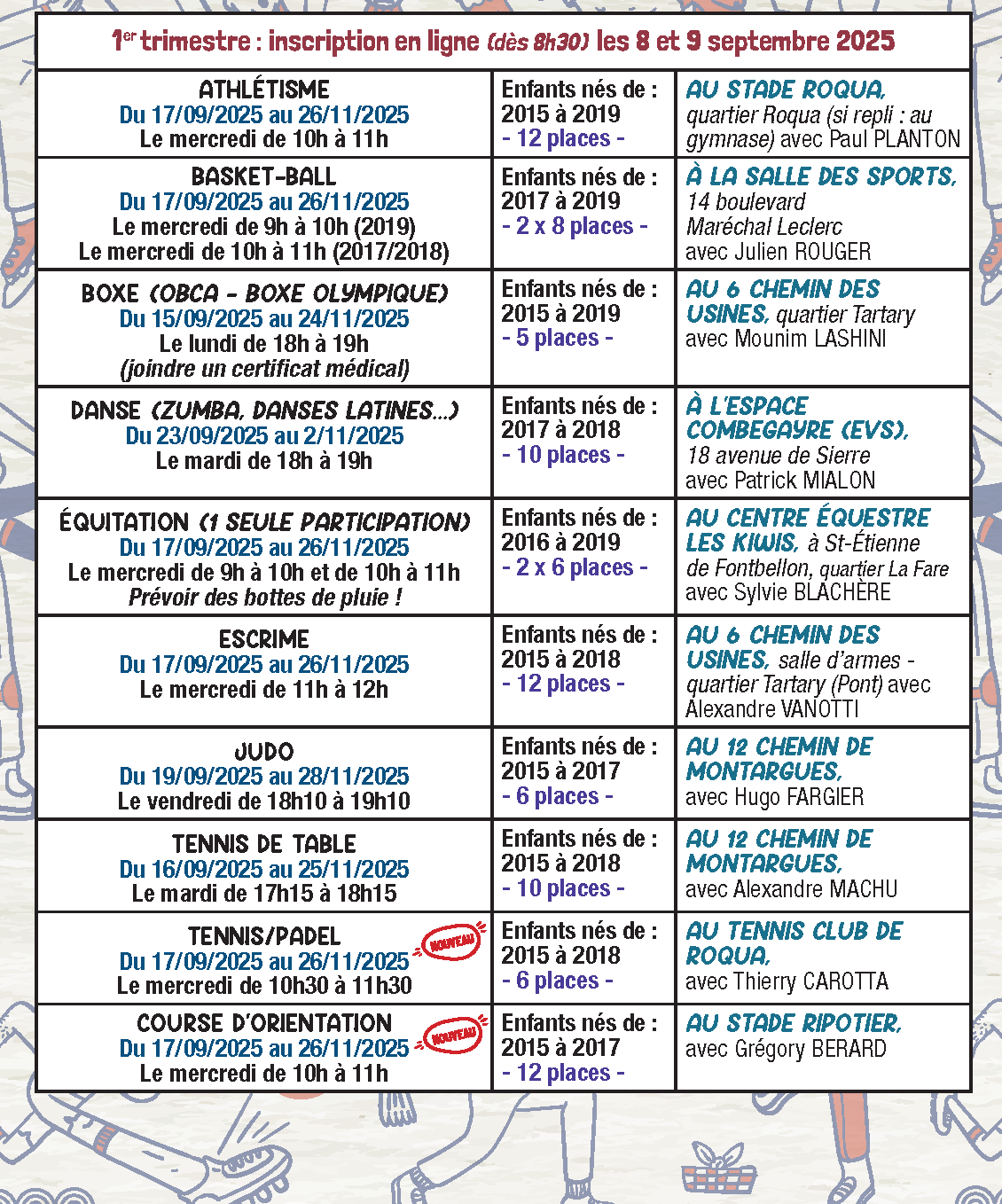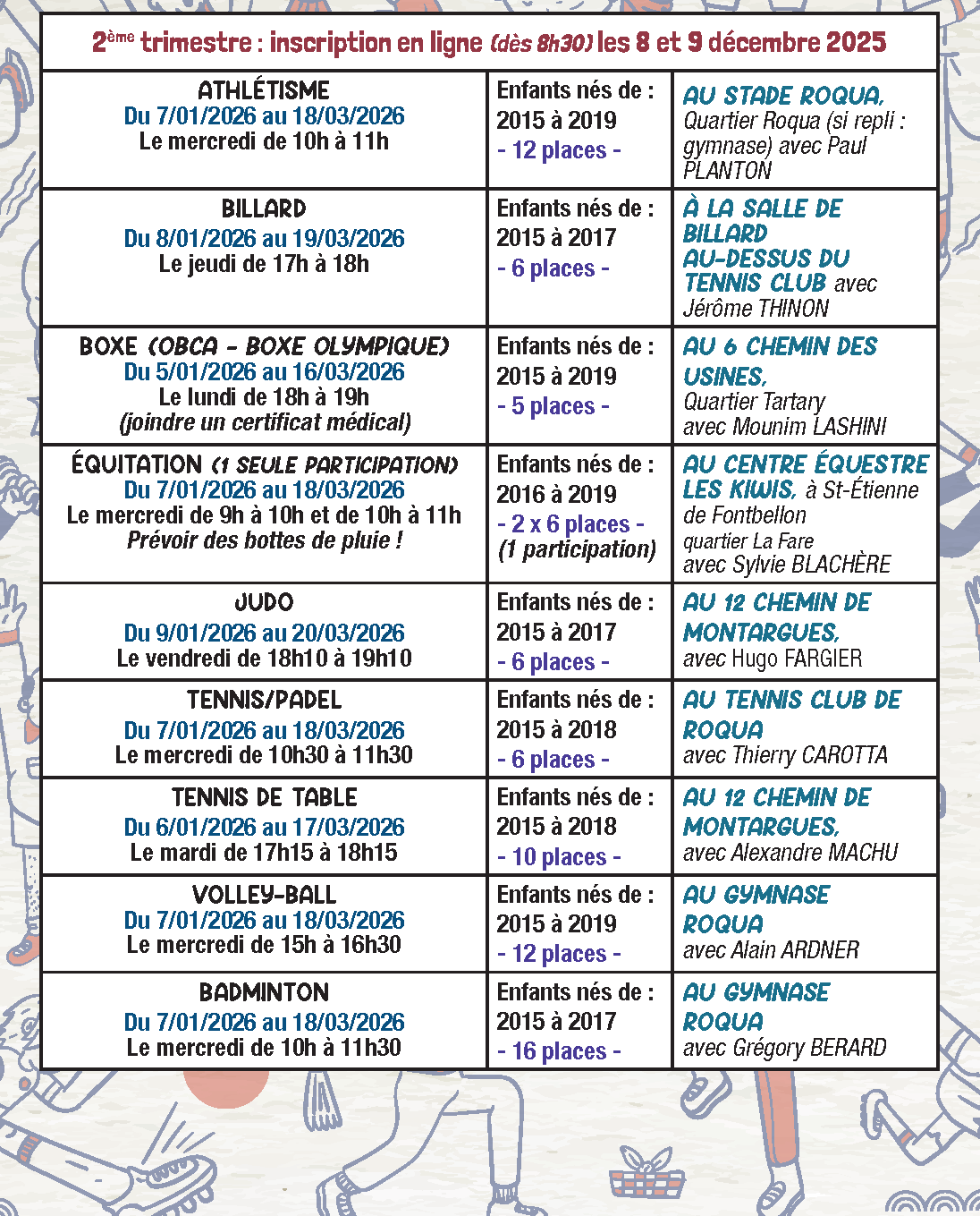 La procédure d’inscription est accessible dès à présent sur le formulaire ci-dessous (bouton jaune). Le formulaire en ligne est accessible à partir de 8h30 les 8 et 9 décembre 2025. Il sera donc inutile de se rendre au service des sports tant que vous n’aurez pas reçu un mail de confirmation d’inscription.