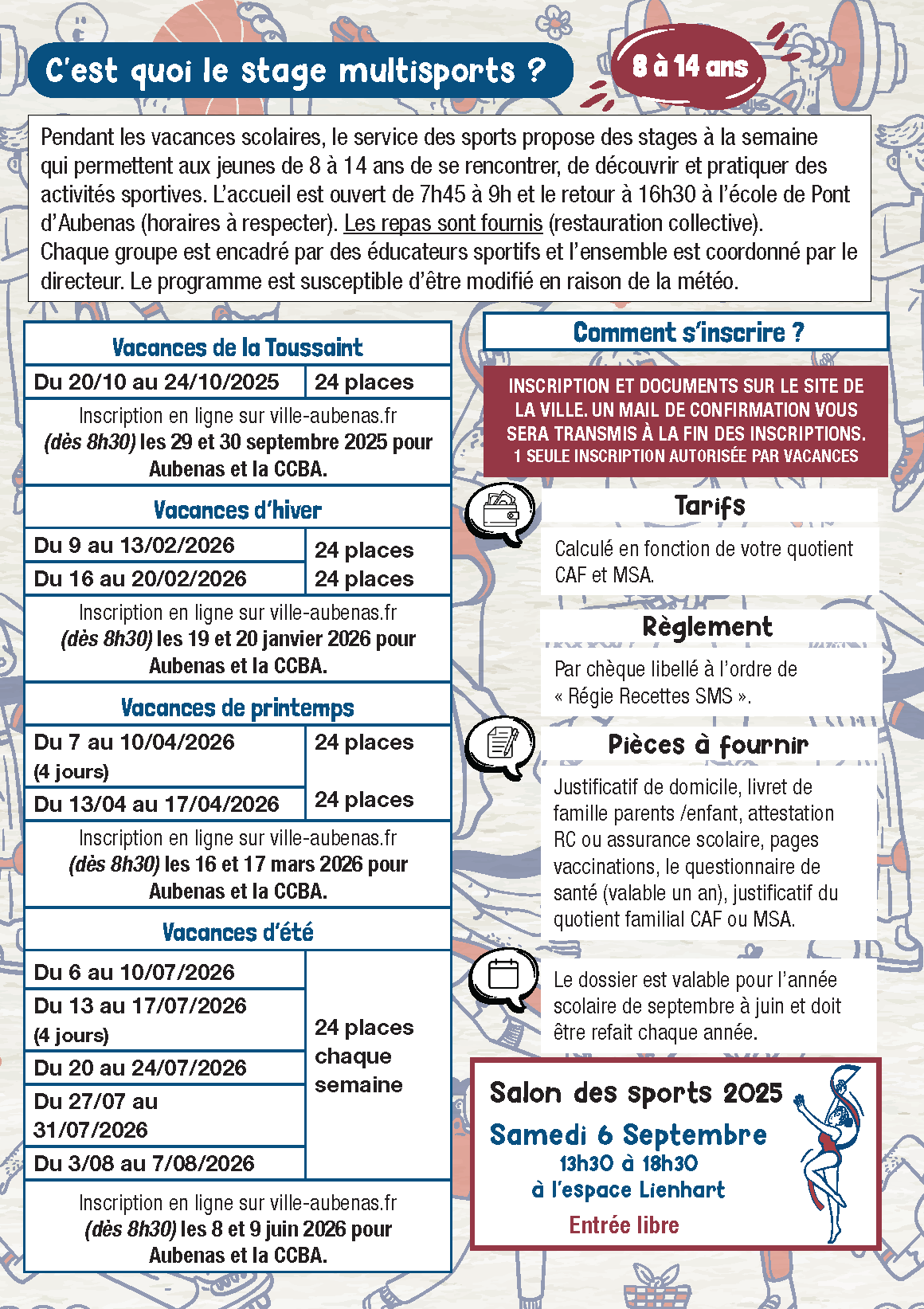 La prochaine session des stages multisports aura lieu pendant deux semaines lors des vacances d'hiver 2026. Inscriptions en ligne dès lundi 19 janvier 2026.